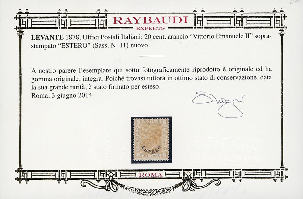 EMISSIONI GENERALI 1878 - 20 cent. arancio soprastampato (11), buona centratura, nuovo, gomma originale integra, perfetto. Cert. Oro ... Leggi tutto