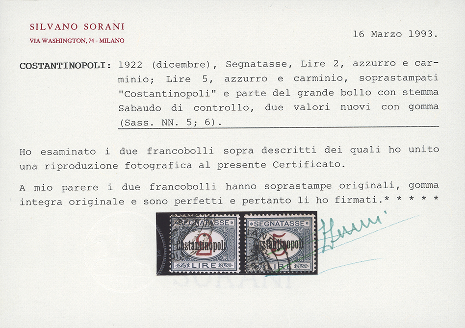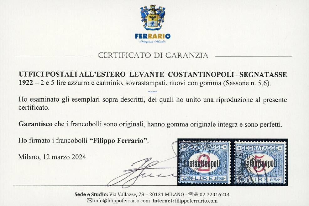 COSTANTINOPOLI SEGNATASSE 1922 - 2 e 5 lire (5,6), i due alti valori della serie, nuovi, gomma originale integra, perfetti. Molto belli. Cert. Sorani e Ferrario.