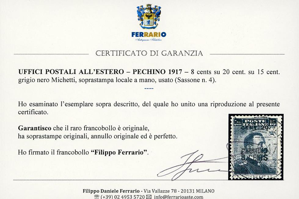 PECHINO 1917 - 8 cent. su 20 cent. su 15 cent. Michetti, soprastampa locale a mano (4), usato, perfetto. Cert. Ferrario.