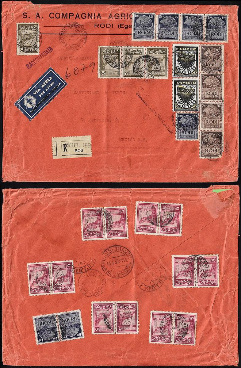 1937 - 10 lire, striscia di tre e singolo, 5 lire, sei coppie, 1,25 lire, striscia di quattro, singolo e coppia, 50 cent., striscia di quattro, Pittorica, 50 cent. posta aerea (61/64,A30), alcuni inevitabili difetti, su aerogramma raccomandato da Rodi 11/4/1937 per il Messico. SI TRATTA DELLA MASSIMA AFFRANCATURA NOTA DELL'EGEO, impreziosita dalla rara destinazione. Insieme unico, rarità del settore! Ferrario.