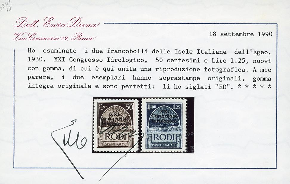 1930 - Congresso Idrologico, serie completa (12/20), nuovi, gomma originale integra, perfetti. Molto belli. Cert. E.Diena per i due alti valori, cert. Ferrario per la serie.