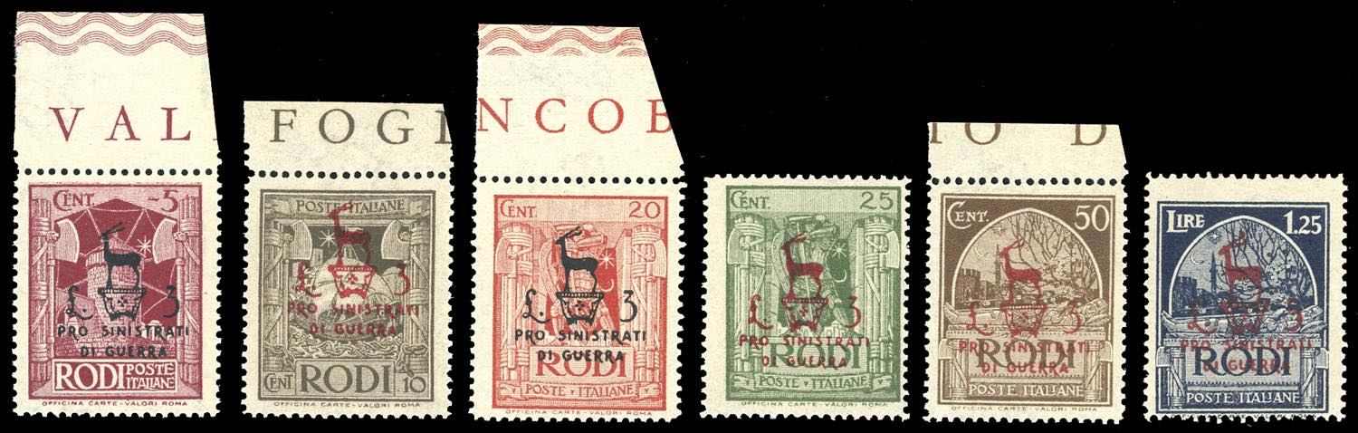 OCCUPAZIONE TEDESCA EGEO 1944 - Pro Sinistrati di Guerra, soprastampati, serie completa (126/131), nuovi, gomma originale integra, perfetti. Ferrario.
