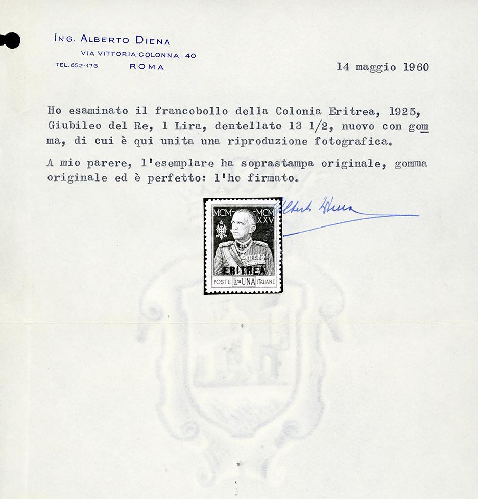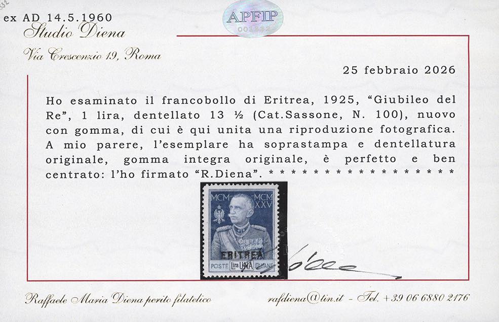 1925 - 1 lira azzurro, Giubileo, dent. 13 1/2 (100), nuovo, gomma originale integra, perfetto e molto ben centrato. Molto fresco e raro. Uno dei migliori esemplari esistenti. Cert. Alberto e Raffaele Diena, Ferrario.