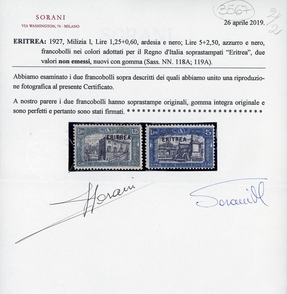 1927 - Milizia, errore di colore, non emessi, serie completa (118A/119A), nuovi, gomma originale integra, perfetti e molto freschi. Ottima qualità. Cert. Sorani.