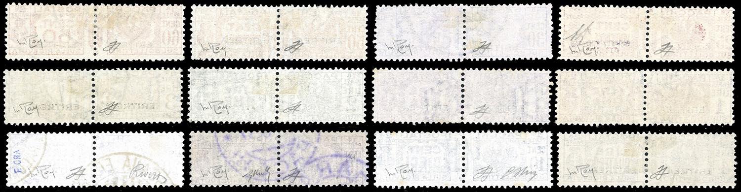 PACCHI POSTALI 1927/37 - Fascio al centro, soprastampati, serie completa con 1 lira ripetuta in lilla (22/32,27a), perfetti, usati con annulli originali. Alti valori firmati da noti periti e Ferrario, la serie cert. Raybaudi.
