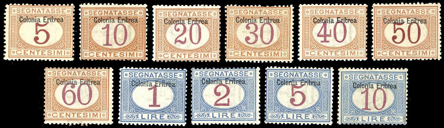 SEGNATASSE 1903 - Soprastampati in alto, serie completa (1/11), nuovi, gomma originale integra, perfetti. N. 6, 9 e 10 firmati Sorani, 10 ... Leggi tutto