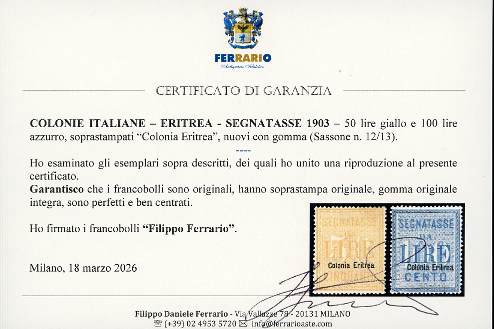 SEGNATASSE 1903 - 50 e 100 lire, alti valori, soprastampati (12/13), nuovi, gomma originale integra, perfetti, ben centrati e freschissimi. ... Leggi tutto