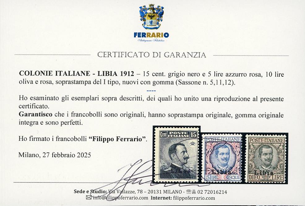 1912/21 - Ordinari soprastampati, serie complete (1/12,18/19,20,33), gomma originale integra, perfetti. Molto freschi. Alti valori cert. Ferrario.