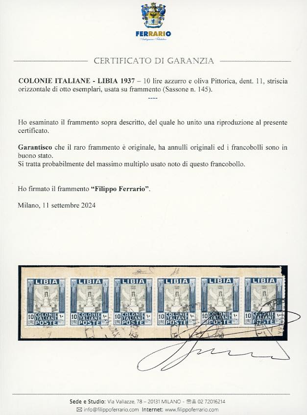 1937 - 10 lire Pittorica, dent. 11 (145), striscia orizzontale di otto esemplari, usata su frammento, buono stato. Estremamente rara, si tratta probabilmente del massimo multiplo usato noto di questo francobollo. Cert. Ferrario.