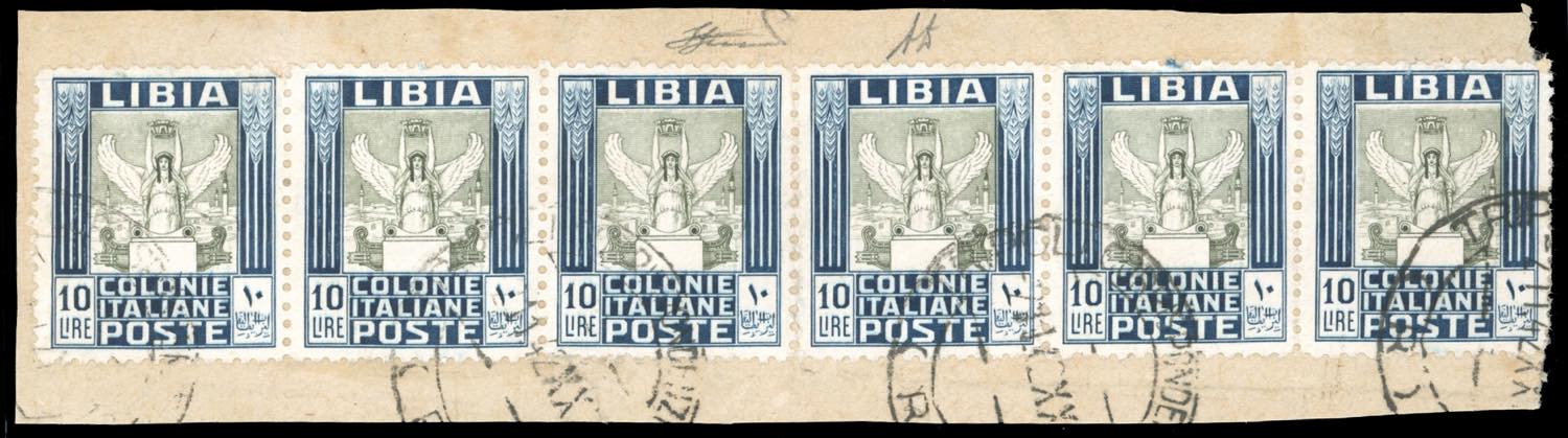 1937 - 10 lire Pittorica, dent. 11 (145), striscia orizzontale di otto esemplari, usata su frammento, buono stato. Estremamente rara, si ... Leggi tutto
