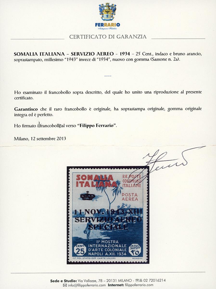 SERVIZIO AEREO 1934 - 25 lire soprastampato, millesimo "1943" invece di "1934" (2a), nuovo, gomma originale integra, perfetto. Raro. Sassone, cert. Ferrario.