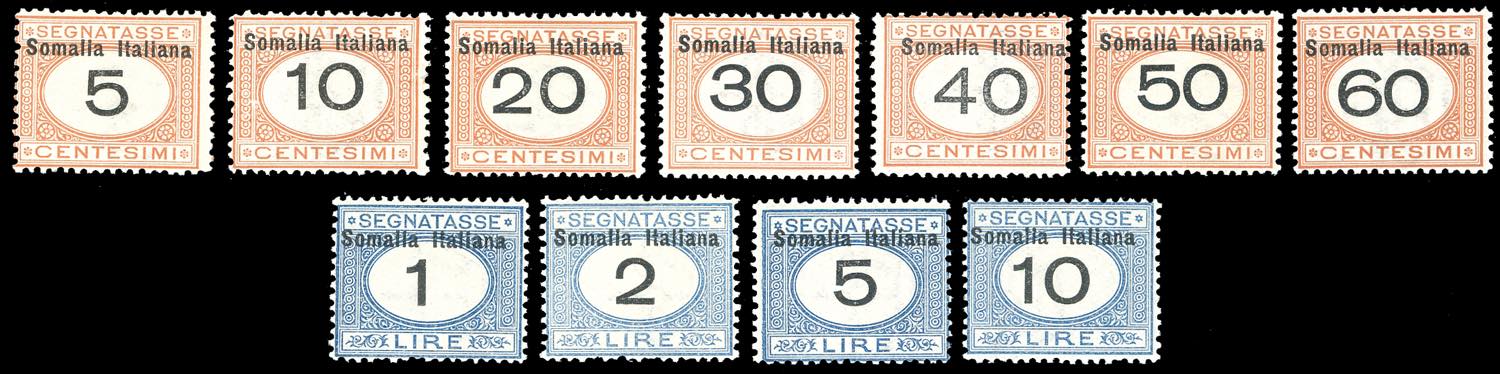 SEGNATASSE 1926 - Cifre nere, soprastampati in moneta italiana, serie completa (41/51), gomma originale integra, perfetti e molto freschi. ... Leggi tutto