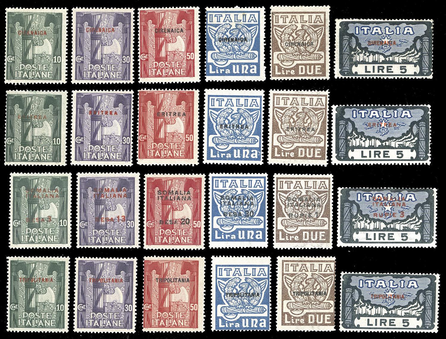 1923 - Marcia su Roma, serie completa, giro delle quattro Colonie (Cirenaica 5/10,Eritrea 65/70,Somalia 49/54,Tripolitania 5/10), nuovi, gomma originale, integra per Eritrea e Tripolitania, perfetti.