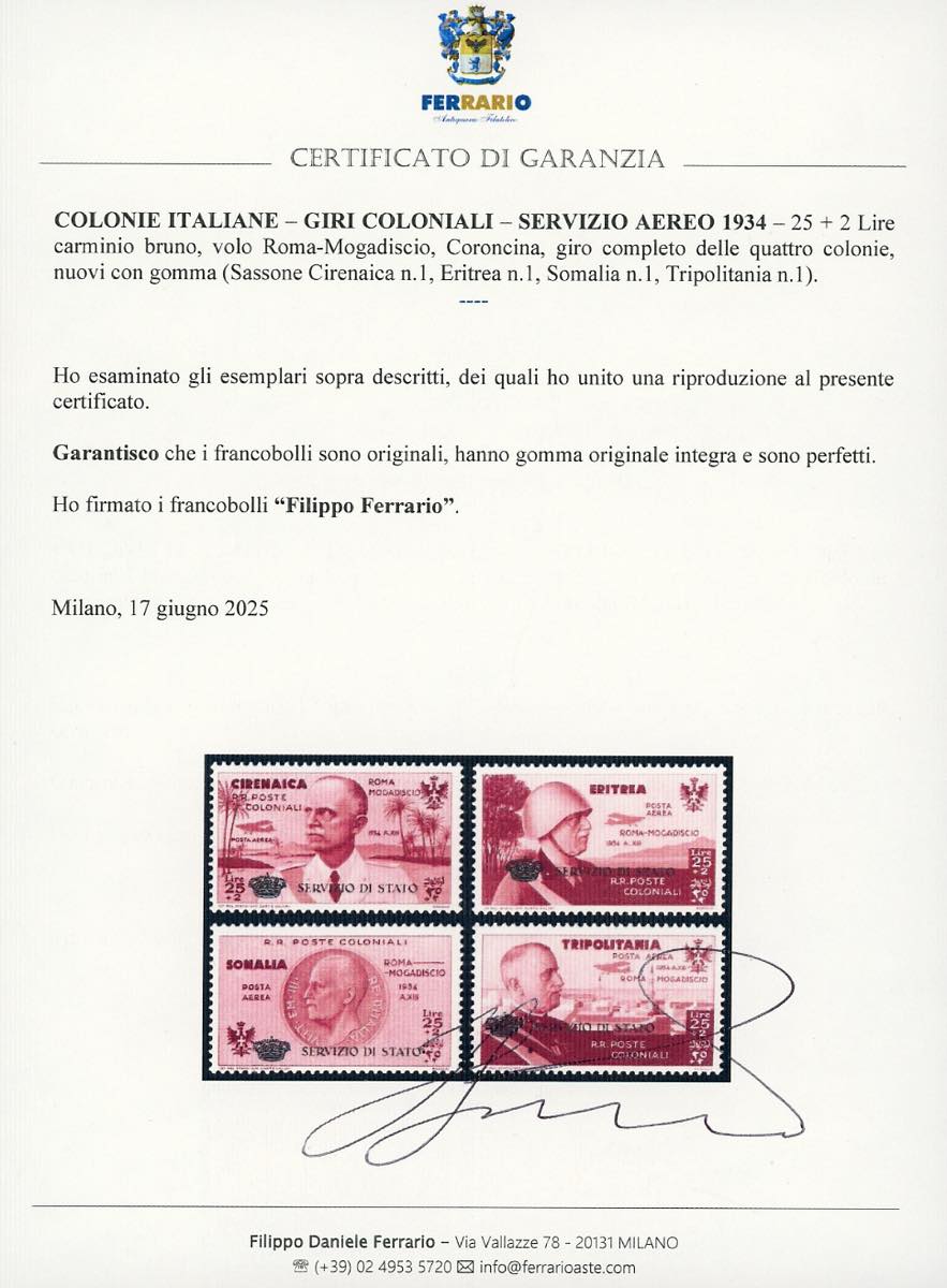 SERVIZIO AEREO 1934 - 25 + 2 lire Coroncina, giro completo delle quattro Colonie (Cirenaica 1,Eritrea 1,Somalia 1,Tripolitania 1), nuovi, gomma originale integra, perfetti. Ottima qualità. Cert. Ferrario.