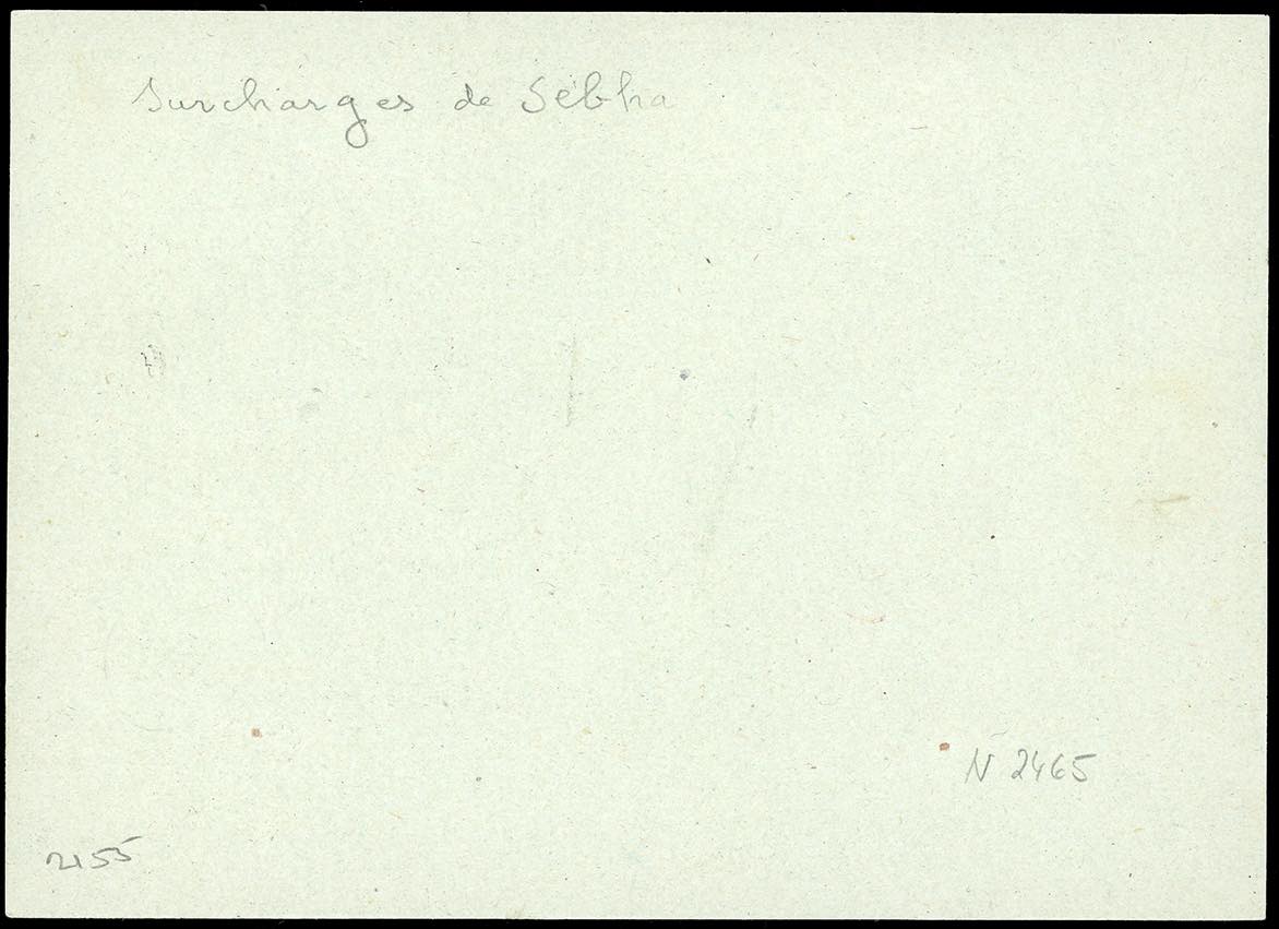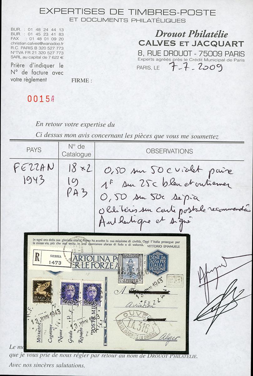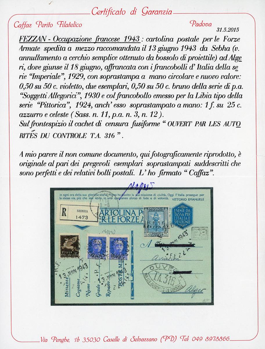 OCCUPAZIONE FRANCESE FEZZAN 1943 - 0,50 fr. su 50 cent., coppia orizzontale, 1 fr. su 25 cent. Pittorica e 0,50 fr. su 50 cent. posta aerea, tutti soprastampati a mano (11,12,A3), perfetti, su cartolina di franchigia militare raccomandata da Sebha 13/6/1943 ad Algeri, su fronte bollo d'arrivo e di censura. Molto rara. Cert. Calves e Caffaz.