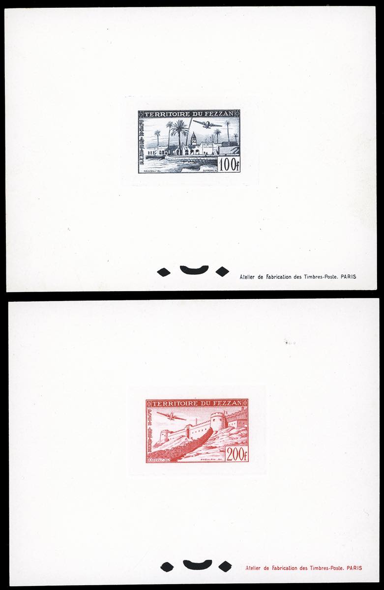 TERRITORIO MILITARE FEZZAN POSTA AEREA 1951 - Seconda emissione, serie completa (3/4), prove di lusso nei colori adottati, perfette. Non comuni.