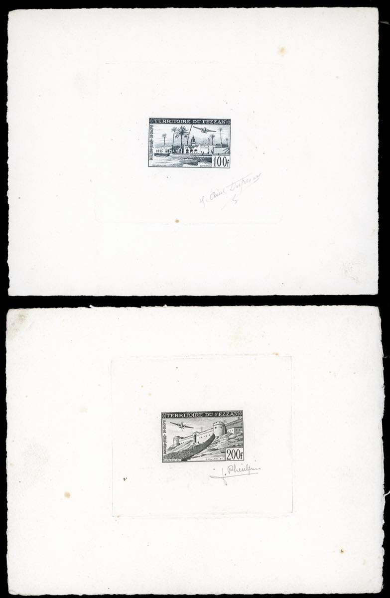TERRITORIO MILITARE FEZZAN POSTA AEREA 1951 - Seconda emissione, serie completa (3/4), prove d'artista in colori diversi da quelli adottati, firmate, perfette. Rare.