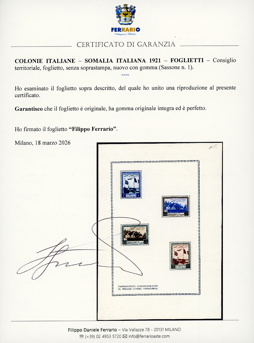 SOMALIA A.F.I.S. FOGLIETTI 1951 - Consiglio territoriale, foglietto, senza soprastampa (1), nuovo, gomma originale integra, perfetto. Cert. Ferrario.