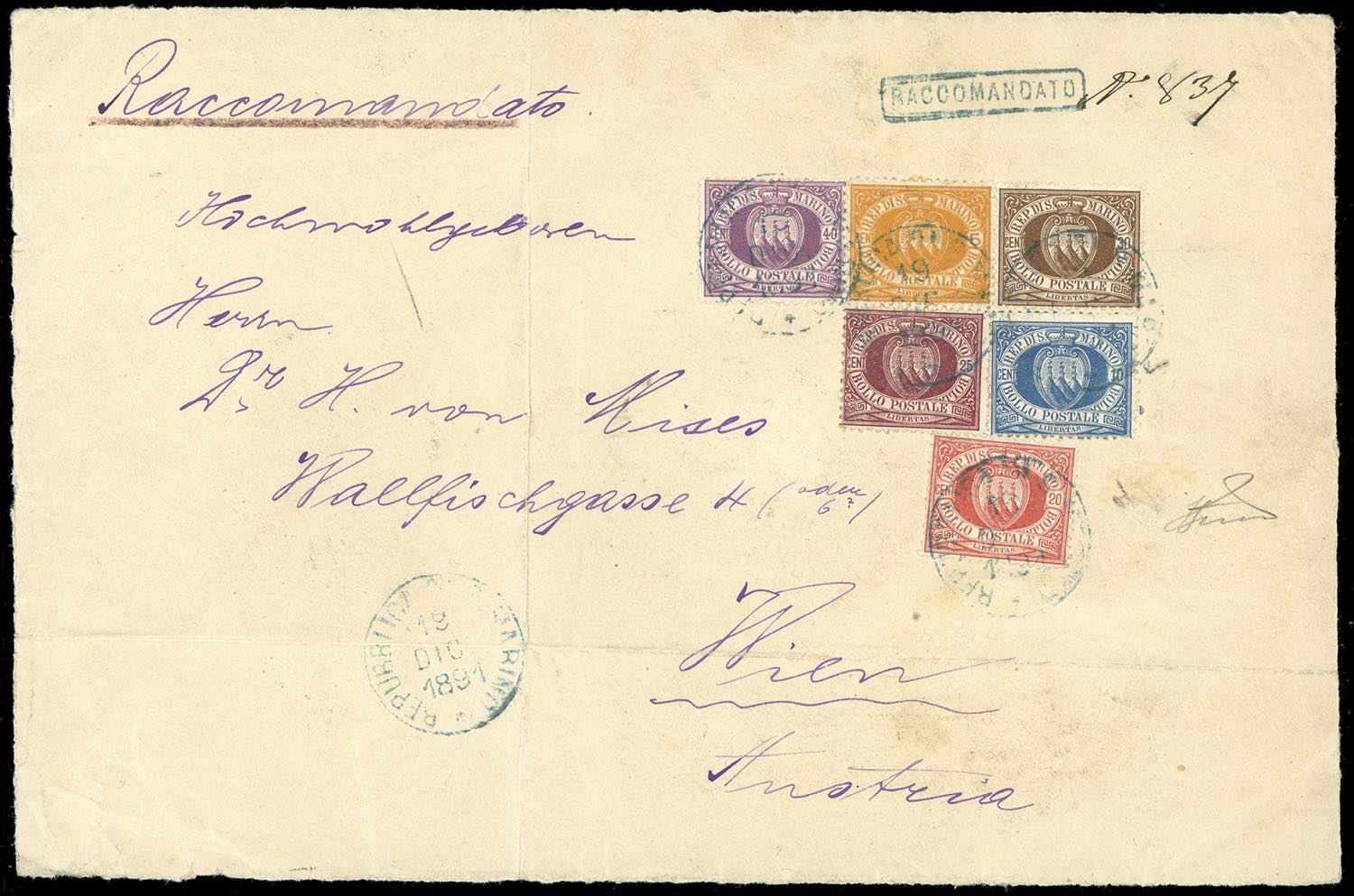 1891 - 5 cent. 10 cent. azzurro, 20 cent., 25 cent., 30 cent. e 40 cent. Stemma (2,3A,4,5,6,7), perfetti, su frontespizio di lettera raccomandata da San Marino 19/12/1891 a Vienna, in Austria, Eccezionale affrancatura esacolore della prima emissione comprendente il raro 10 cent. azzurro, di ottima qualità. Ferrario.