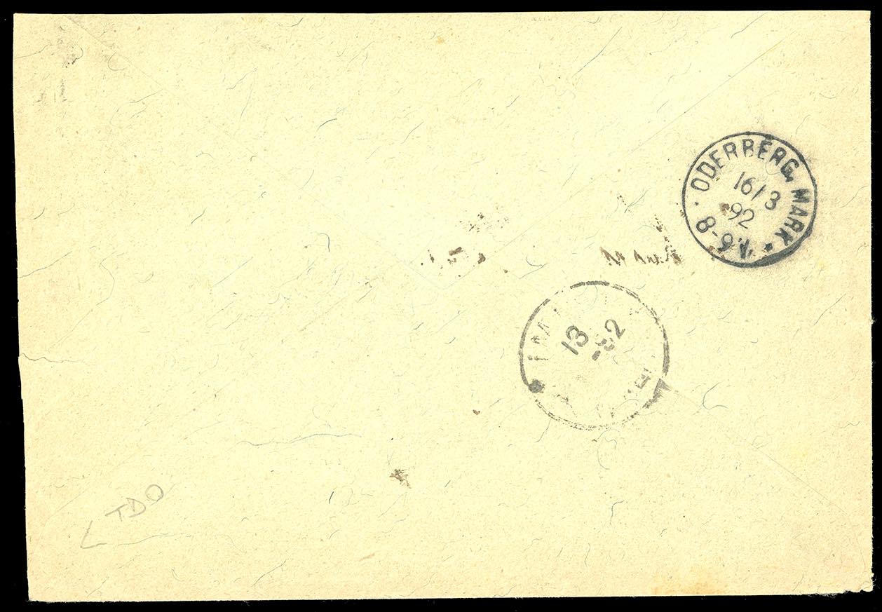 1892 - 10 cent. azzurro, 25 cent. lacca e 40 cent. lilla scuro, Stemma, prima emissione (3A,5,7), perfetti, su raccomandata del 13/3/1892 per Oderberg Mark in Germania, bollo d'arrivo. Bella tricolore e molto rara per l'uso postale del n. 3A. Cert. Ferrario.