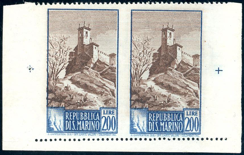 1949 - 200 lire Paesaggi, coppia non dentellata verticalmente (355f), angolo di foglio, gomma originale integra, perfetta. Non comune. ... Leggi tutto