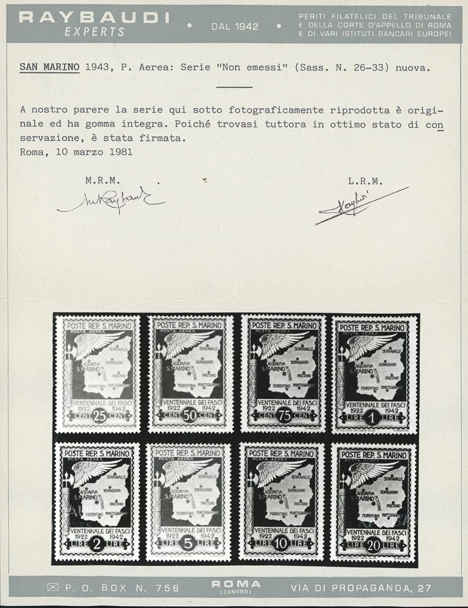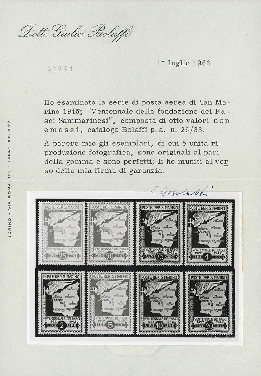 1943 - Ventennale dei Fasci, non emessi, serie completa (26/33), nuovi, gomma originale integra, perfetti e molto freschi. A.Diena, cert. G.Bolaffi e Raybaudi.