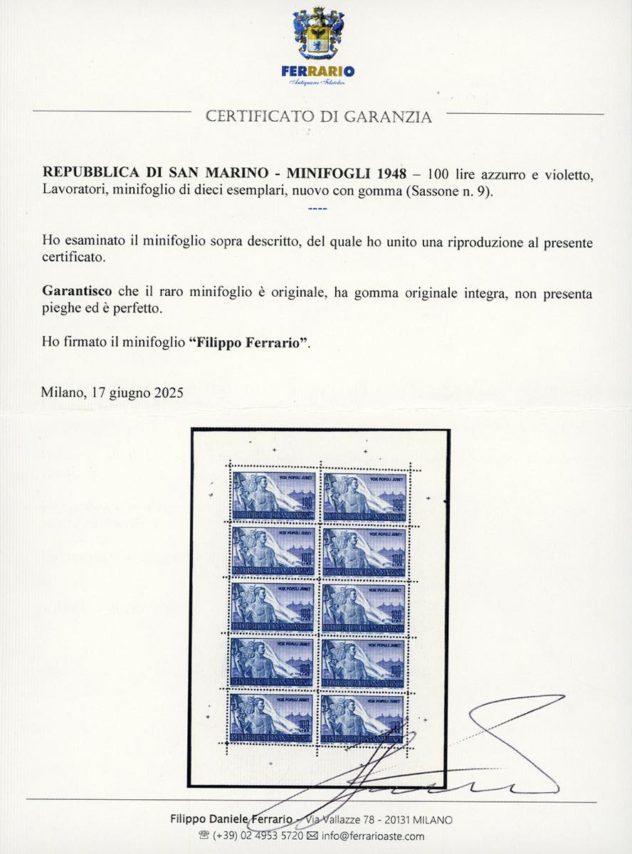 1948 - 100 lire Lavoratori, minifoglio (9), perfetto e non piegato, nuovo, gomma originale integra. Bellissimo. Cert. Ferrario.