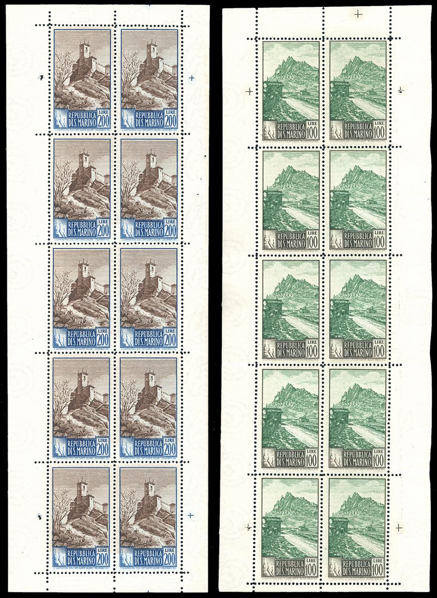 1949 - 100 e 200 lire Paesaggi, minifogli di 10 esemplari (10/11), nuovi, gomma originale integra, perfetti, lieve piega orizzontale in ... Leggi tutto