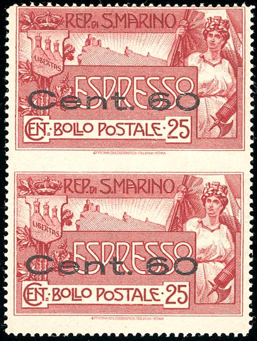 Lotto 2233 - 1923 - 60 cent. su 25 cent. coppia verticale non dentellata ...