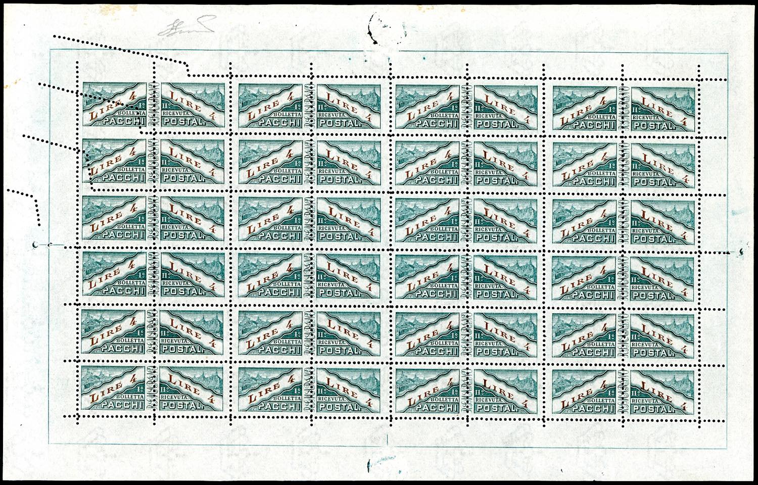 1945 - 4 lire, filigrana corona coricata (26), foglio completo di ventiquattro esemplari con bella ed inedita varietà di dentellatura causata da una piega del foglio che interessa gli esemplari dell'angolo superiore sinistro, gomma originale integra, perfetto. Insieme unico e di ottima qualità. Ferrario.