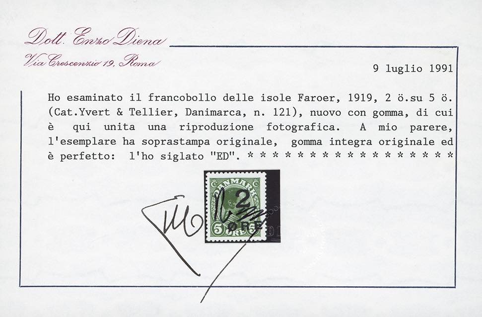 FAROER 1919 - 2 o. su 5 o. soprastampato (1), nuovo, gomma originale integra, perfetto. Cert. E.Diena.