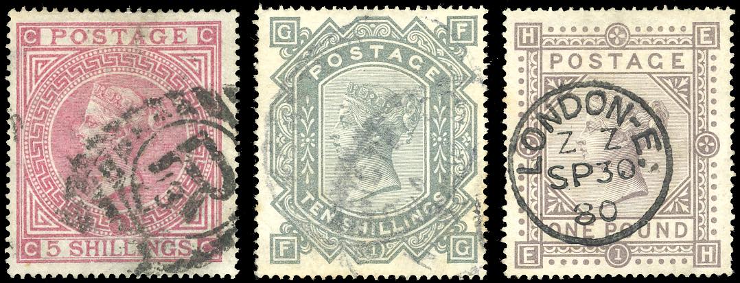 GRAN BRETAGNA 1867/78 - Regina Vittoria, alti valori, filigrana Croce di Malta, serie completa (40/42), usati, perfetti. A.Diena/ Em.Diena/ Mezzadri.
