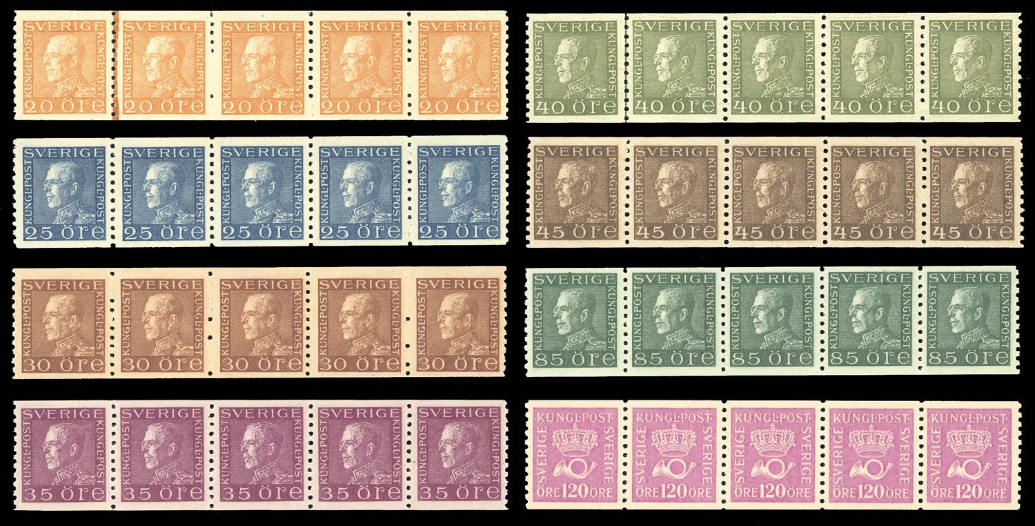SVEZIA 1925/26 - Ordinaria, carta colorata, otto valori (197,198,199,199A,199B,199C,200,203A), strisce di cinque esemplari per tutti, ... Leggi tutto