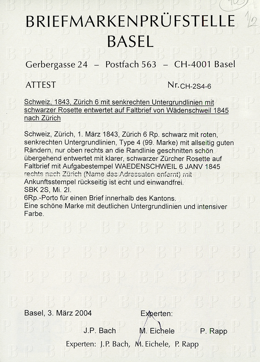 Lotto 2385 - SVIZZERA CANTONALI ZURIGO 1845 - 6 rp., fondo a linee ...