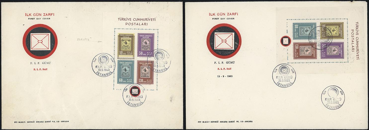 TURCHIA FOGLIETTI 1963 - Giornata FIP, foglietto (BF11), varietà stampa del nero spostato in basso sul n. 1671A, usato su busta FDC. Allegato confronto.