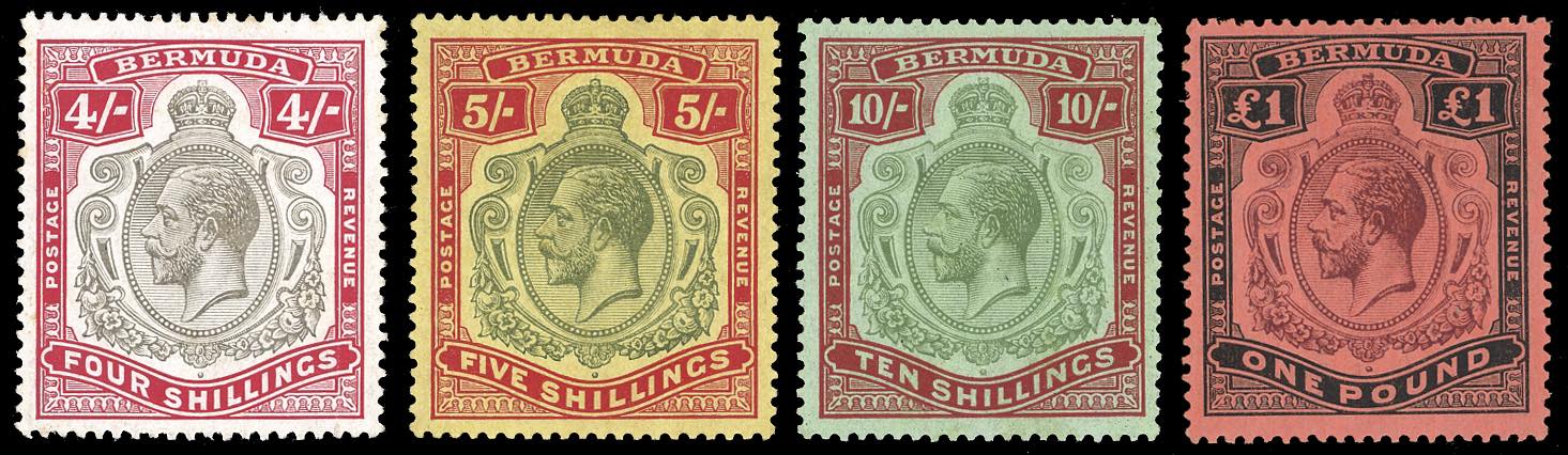 BRITISH COLONIES-BERMUDA 1910/20 - 4 sh., 5 sh., 10 sh. e 1 £ Giorgio V (Yv.49,50,51,52), nuovi, gomma originale, MH, perfetti.