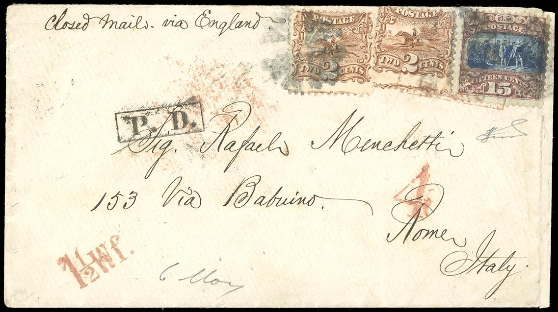 STATI UNITI D'AMERICA 1870 - 2 cent. Pony Express, due esemplari, 15 cent. Sbarco Colombo, II tipo (Unificato 34,39a), su busta da New York a Roma 27/2/1870, sul fronte bollo PD in cartella e due bolli di tassazione in rosso. Pregevole incoming mail per lo Stato Pontificio. Ferrario.