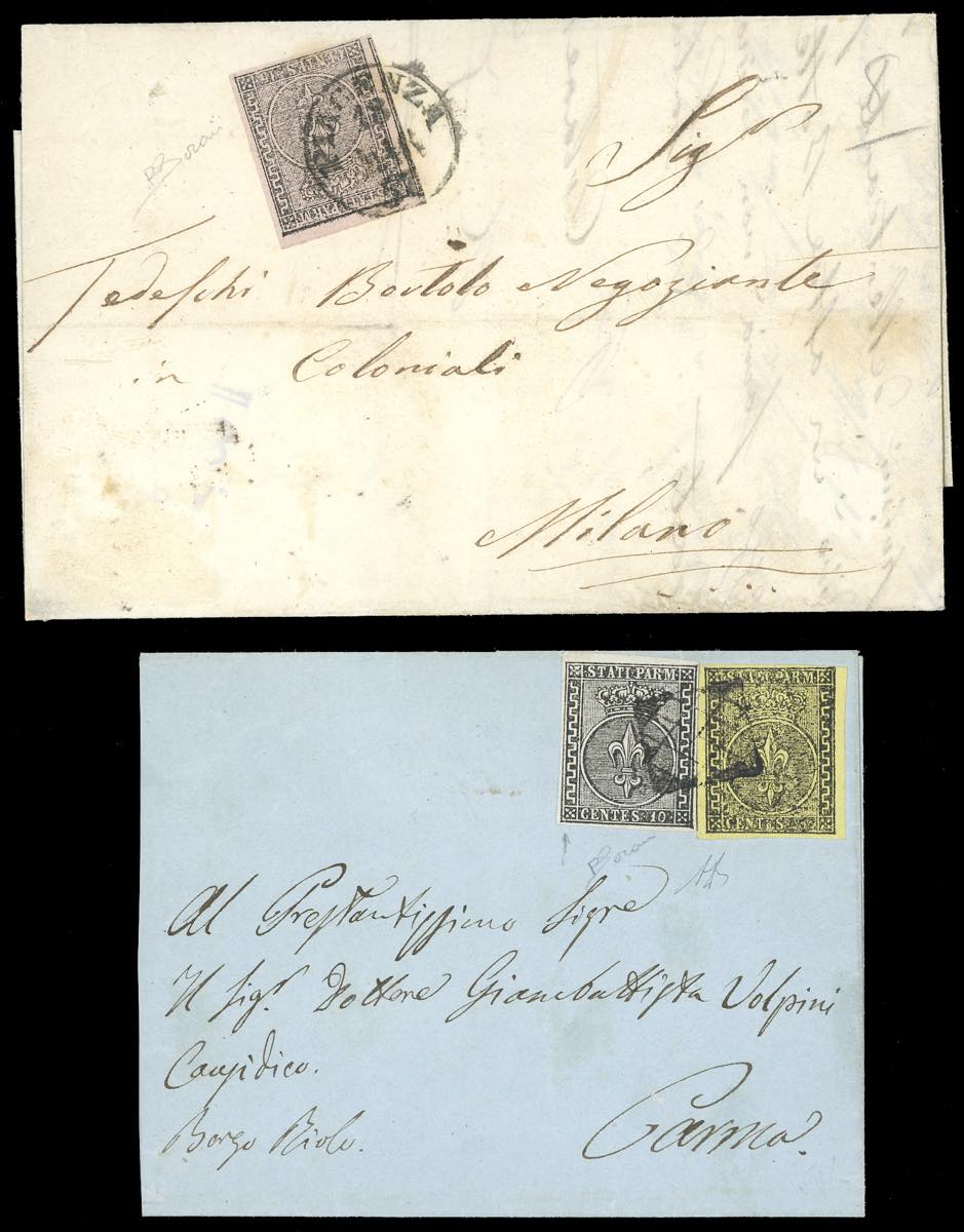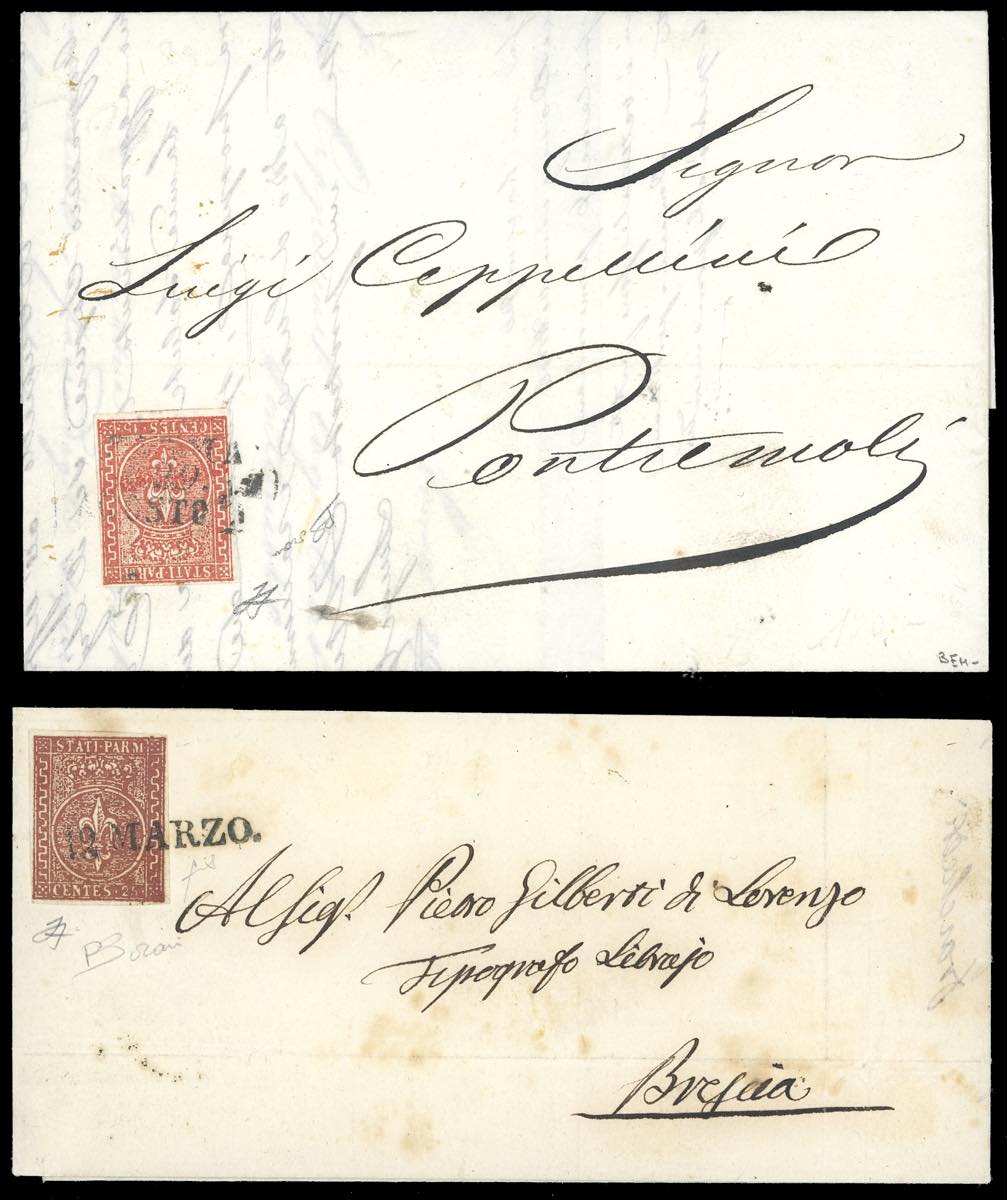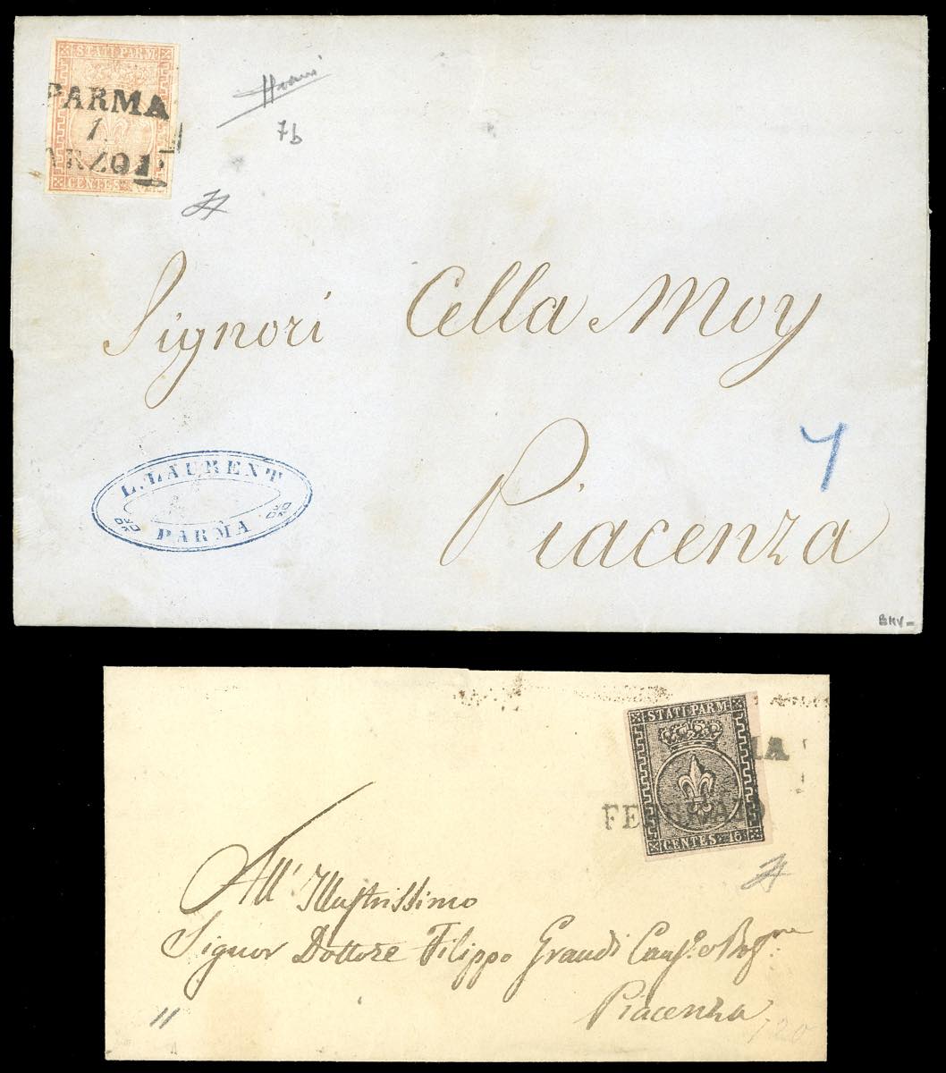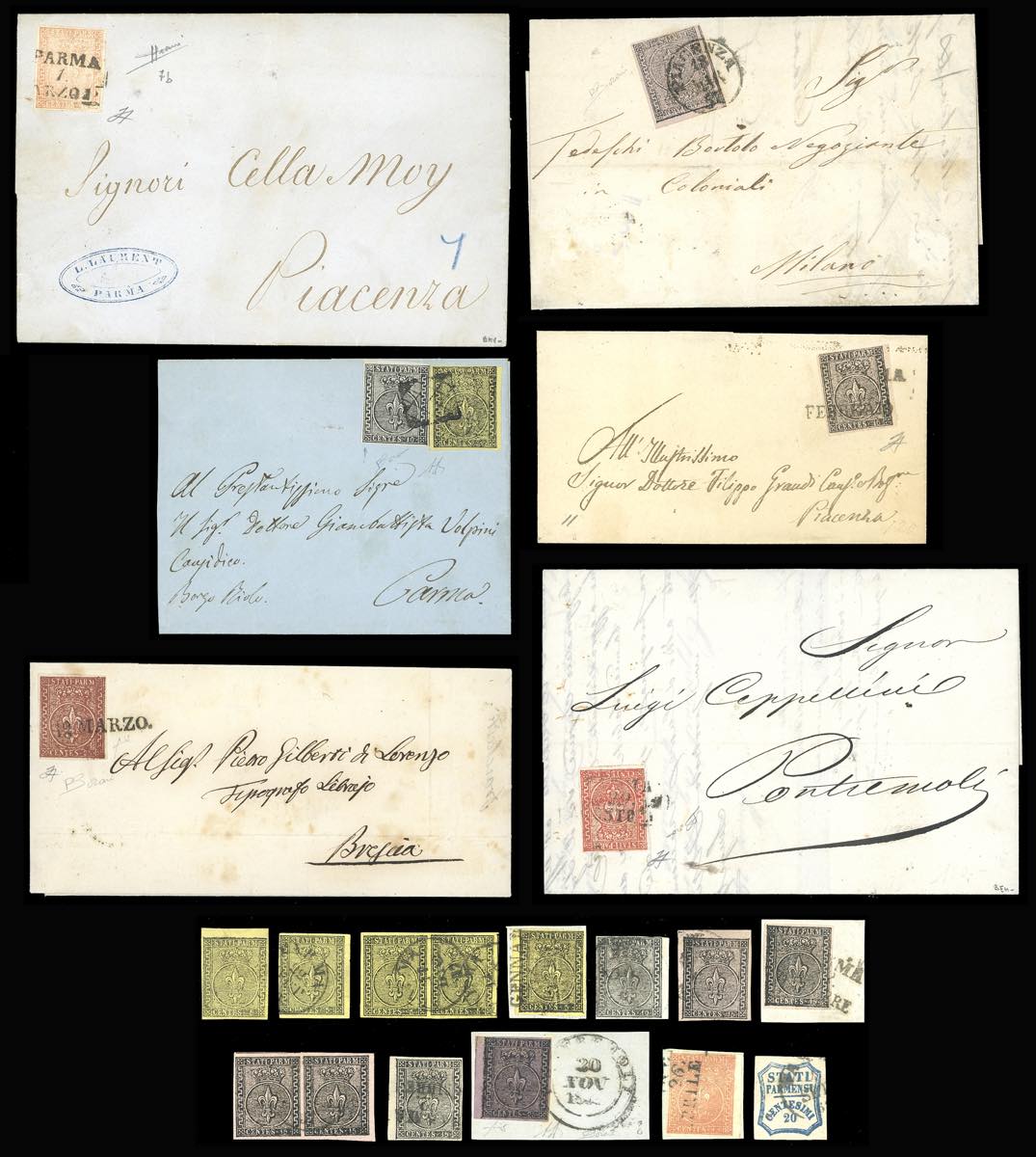 PARMA 1852/59 - Bell'insieme di 14 francobolli e lettere del periodo. Qualità ottima, esemplari e lettere firmate da noti e affidabili periti.