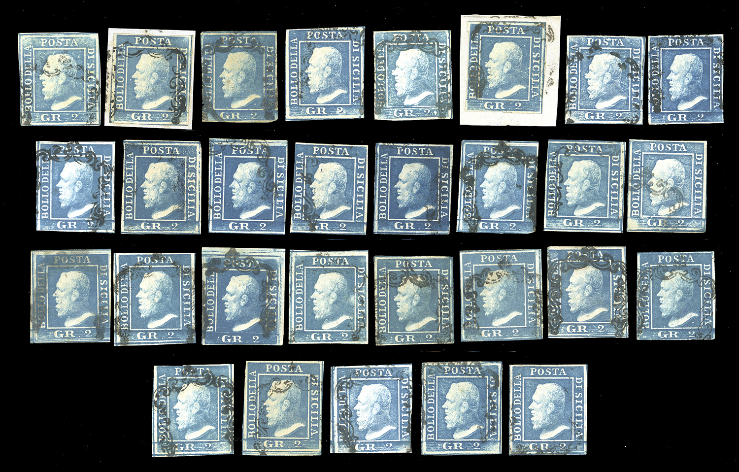 SICILIA 1859 - 2 grana bell'insieme di 29 esemplari usati, dalle varie tavole, con buona varietà di tinte. Molti esemplari sono firmati e plattati da noti periti. Alto valore di catalogo. Ex coll. Imperato.