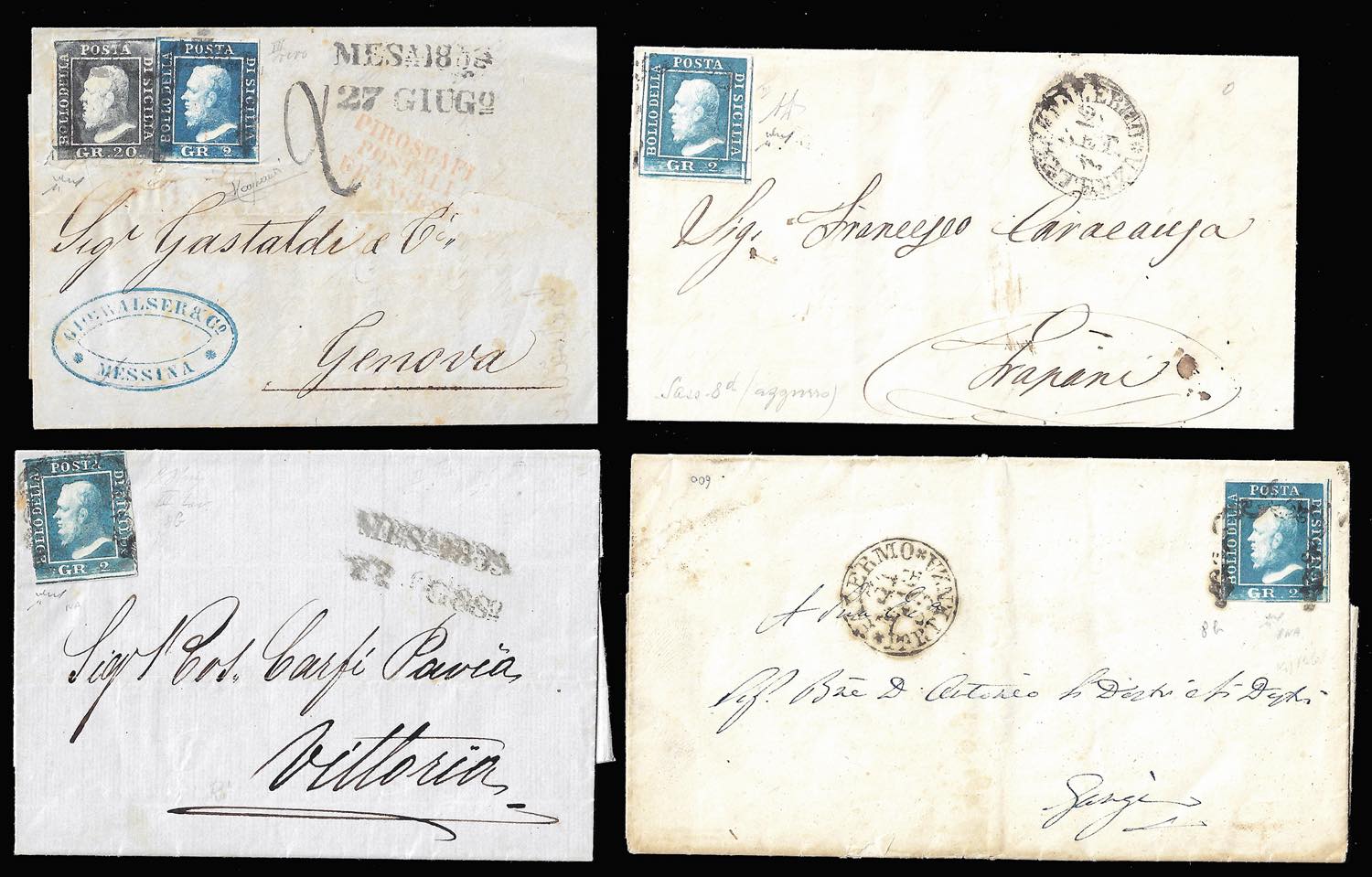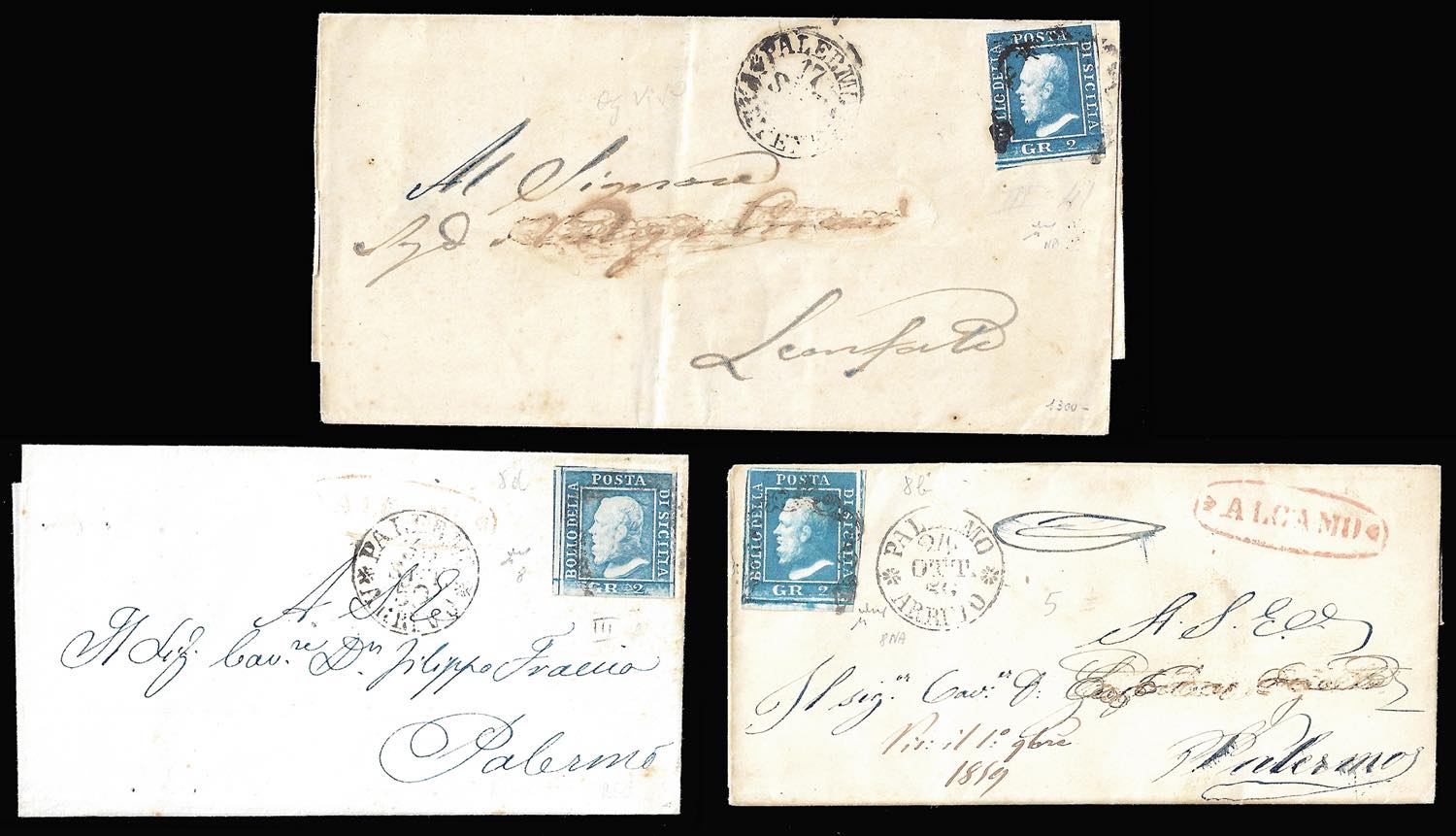 SICILIA 1859/1860 - Lotto di undici lettere affrancate, buona varietà di tinte. Tre lettere con lievi difetti, otto con francobolli perfetti. Notate due lettere punti 8. Ex coll. Imperato.
