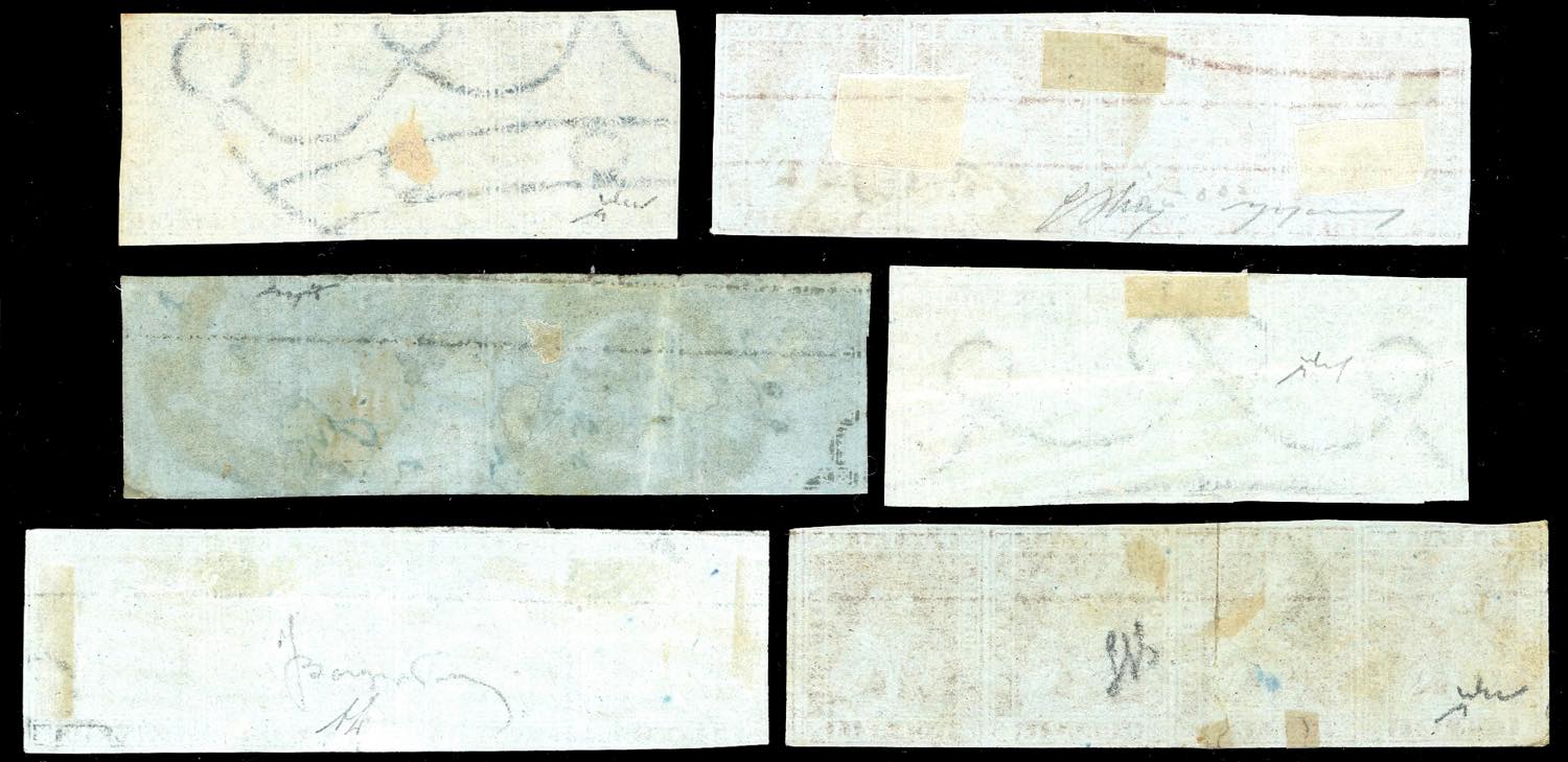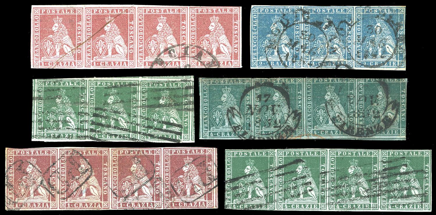 TOSCANA 1851 - Raro insieme di sei strisce orizzontali, di tre o quattro esemplari, dei valori da 1 crazia, 2 crazie e 4 crazie della I emissione, usate, qualità mista. Tutte firmate, elevatissimo valore di catalogo. Ex coll. Imperato.