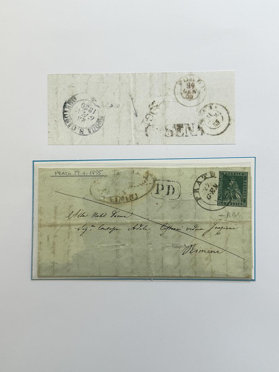 TOSCANA/STATO PONTIFICIO SANITA' 1849/1855 - Interessante insieme di 7 lettere affrancate e 8 non affrancate tra la Toscana e lo Stato Pontificio, tutte con bolli e/o tagli di disinfezione. Alto valore di catalogo. Ex coll. Imperato.