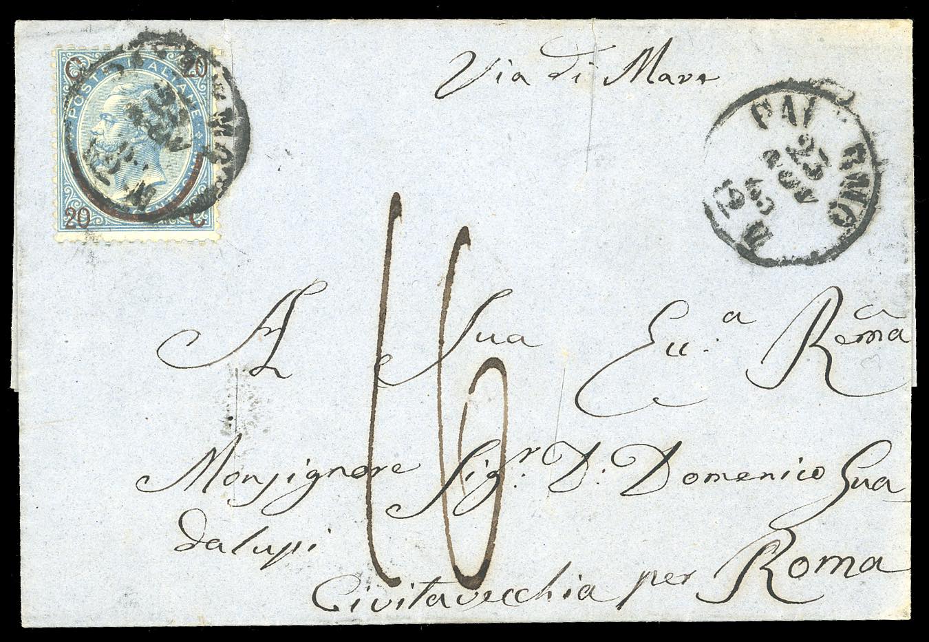 REGNO D'ITALIA SANITA' 1865 - Cinque lettere per lo Stato Ponitificio, quattro da Palermo a Roma "via di mare", tassate 16 baj e una di tre ... Leggi tutto