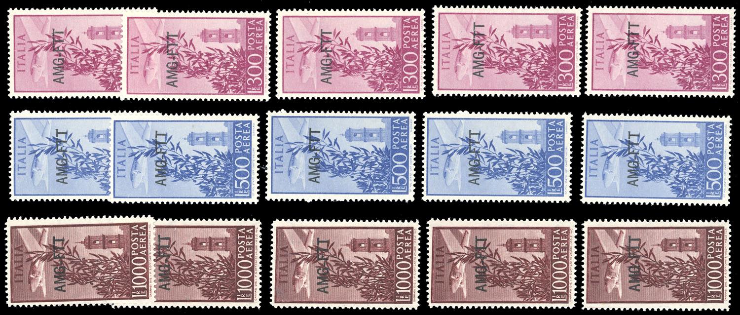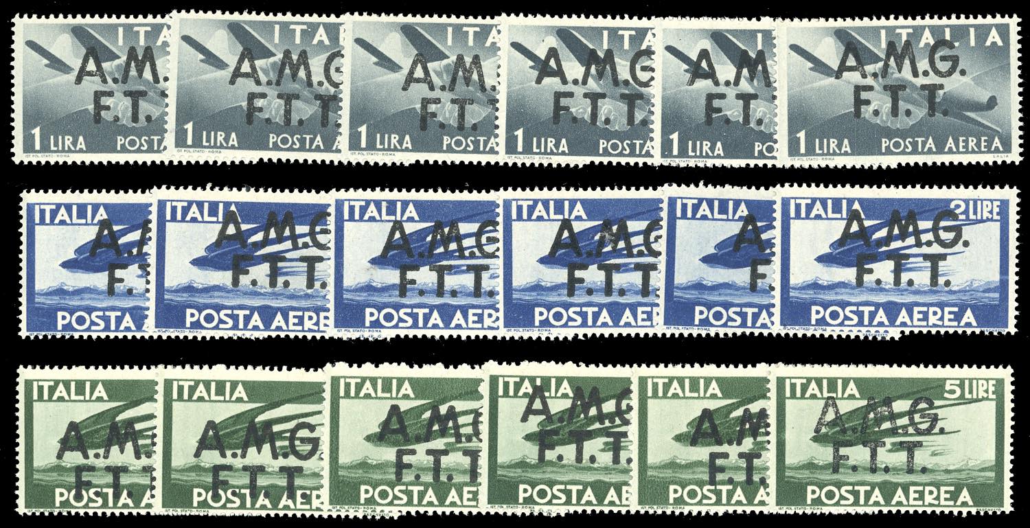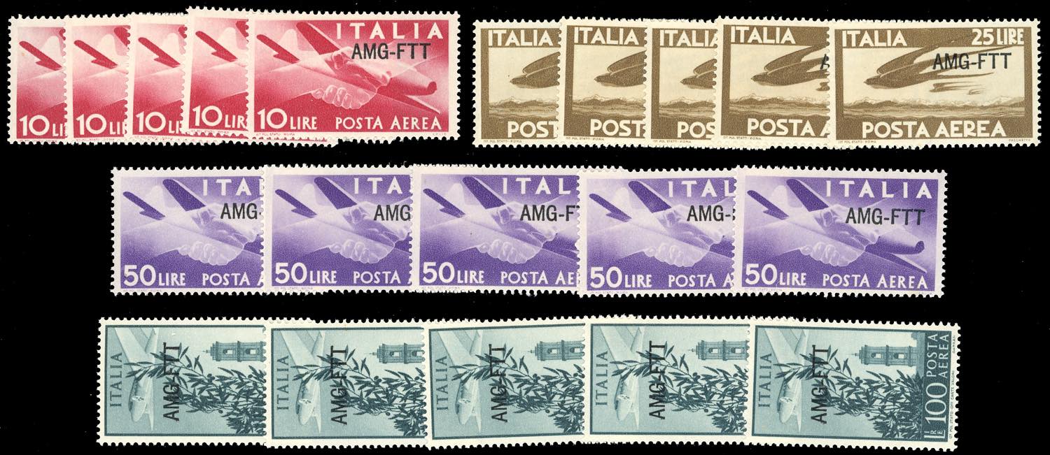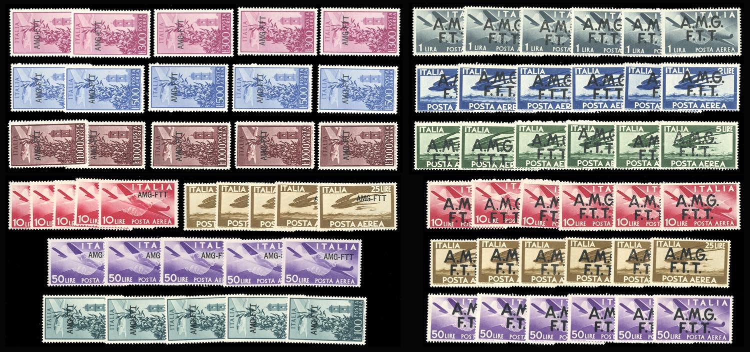 TRIESTE A POSTA AEREA 1947/52 - Sei serie complete della prima emissione (1/6), e cinque serie complete dell'emissione con soprastampa su ... Leggi tutto