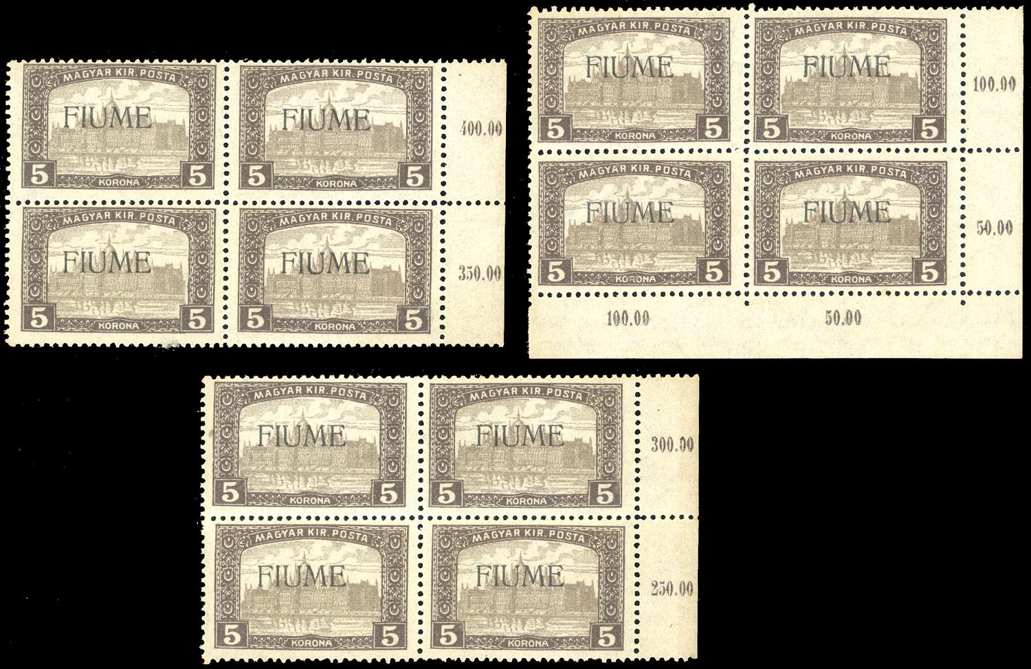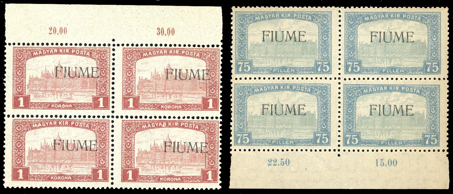 FIUME 1918/19 - 75 f. blocco di quattro (15), 1 k. due blocchi di quattro e altri cinque esemplari (17), 5 k. tre blocchi di quattro (20), ... Leggi tutto