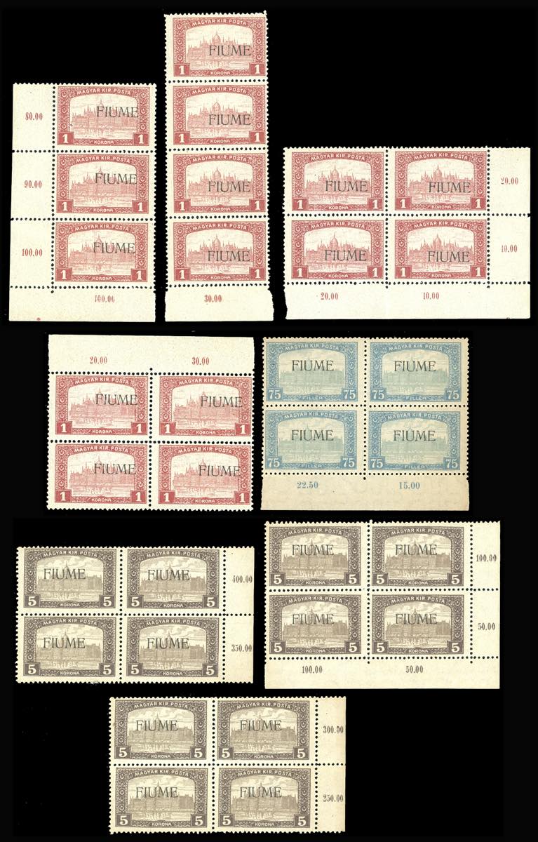 FIUME 1918/19 - 75 f. blocco di quattro (15), 1 k. due blocchi di quattro e altri cinque esemplari (17), 5 k. tre blocchi di quattro (20), nuovi, gomma originale integra, perfetti, soprastampe a macchina. Ottima qualità.