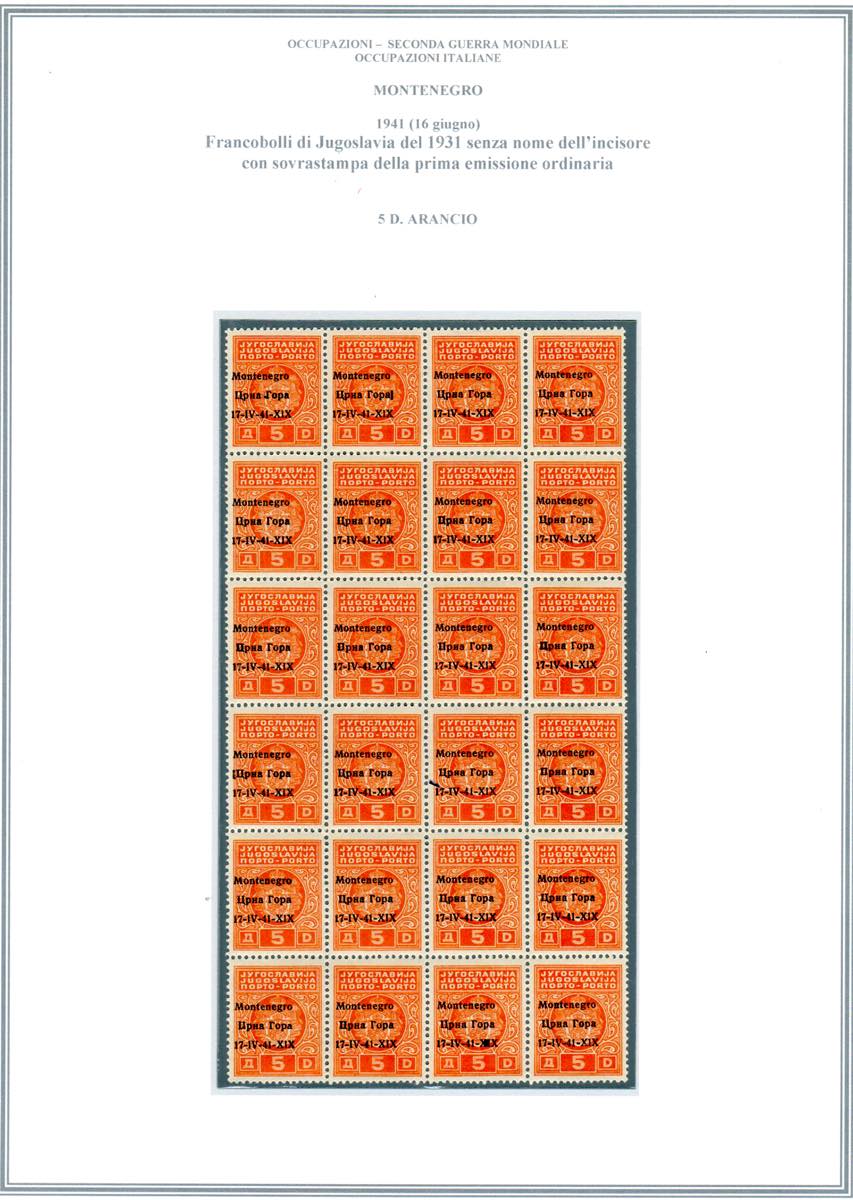 MONTENEGRO OCCUPAZIONE ITALIANA SEGNATASSE 1941 - 5 d. soprastampato, soprastampa spostata a sinistra, varietà non catalogata (4), blocco di 24 esemplari, gomma originale integra, perfetto. Cat. Sassone € 12.000, per i francobolli normali.