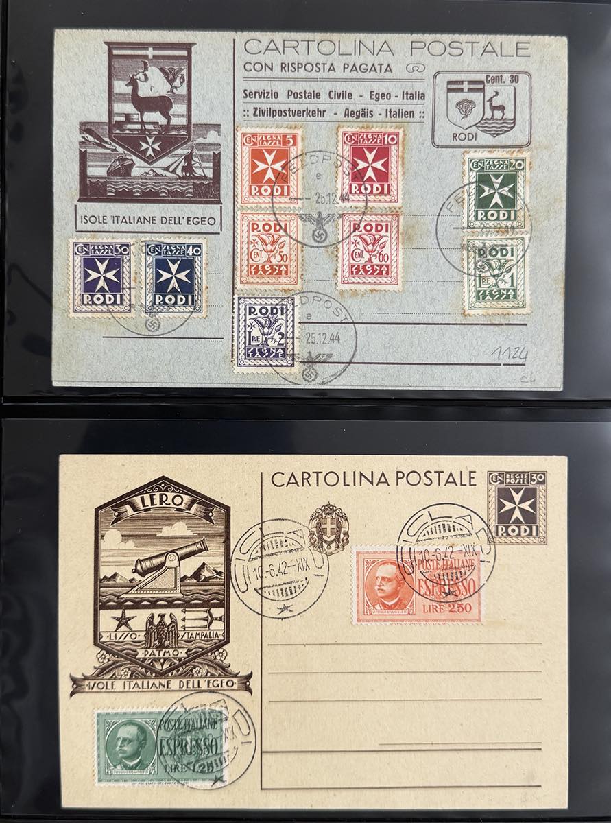 EGEO INTERI POSTALI 1942/1944 - Bell'insieme di 13 cartoline postali con affrancature aggiuntive tra cui Pro Assistenza Egeo e Inselpost. Annulli di pregio, tra cui: Feldpost, Sporadi e Cicladi. Insieme non comune.