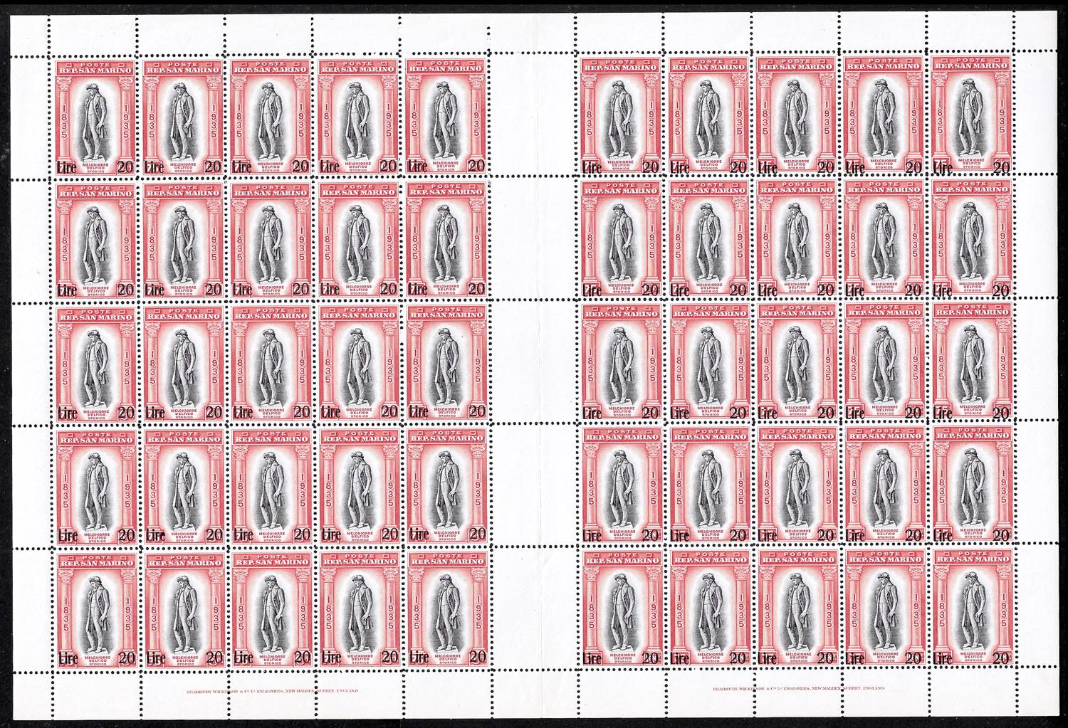 SAN MARINO 1942 - 20 lire su 75 cent. Delfico soprastampato (227), foglio doppio di 50 esemplari con interspazio di gruppo al centro, gomma originale integra, perfetto. Bello e non comune.