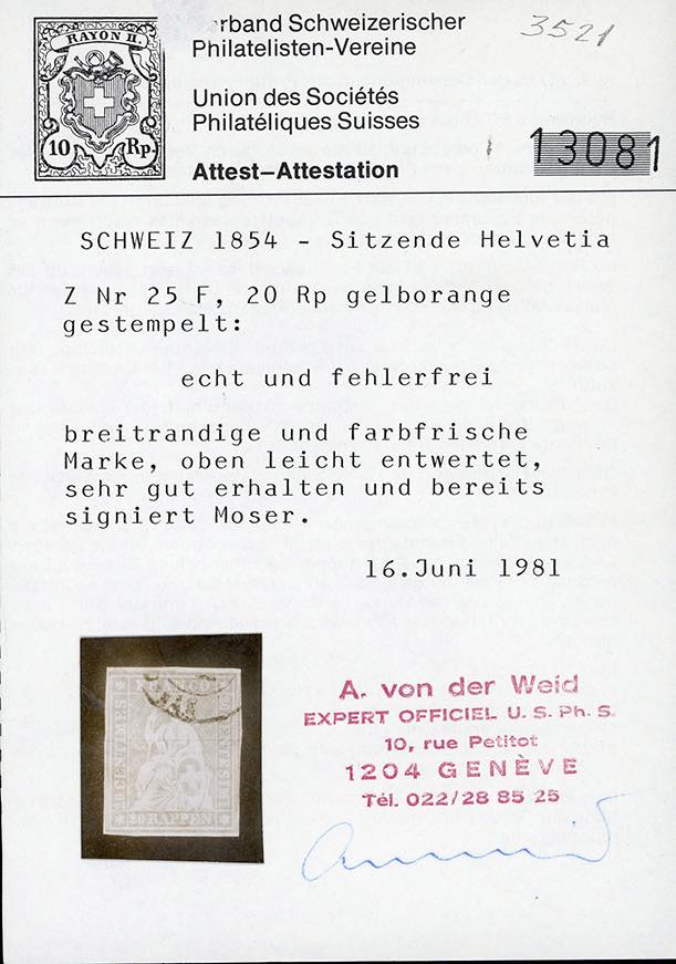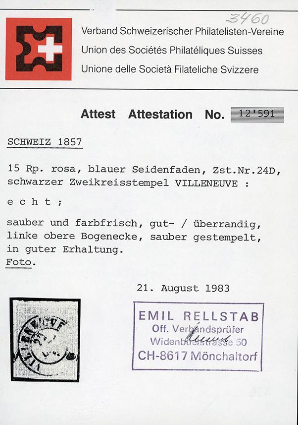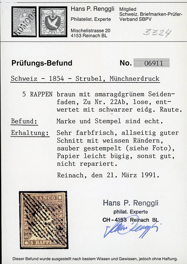 SVIZZERA 1854/1862 - Cinque esemplari Strubel usati (Zumstein n. 22Ab,23F,24Aa,24D,25F), allegati cinque certificati autorevoli.